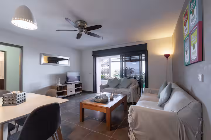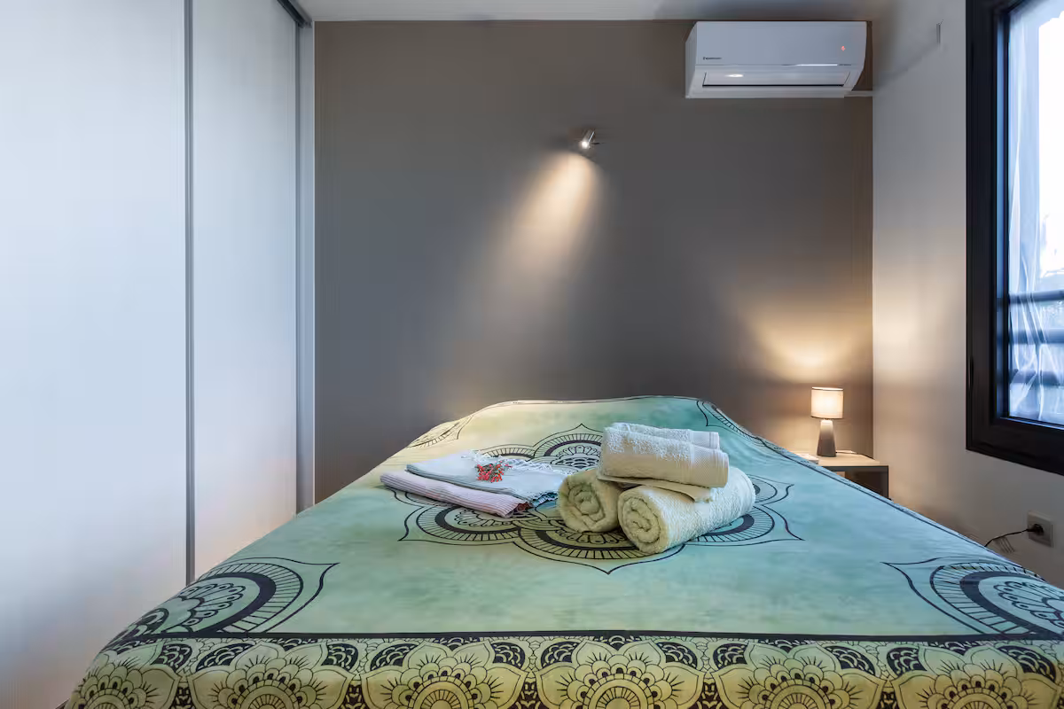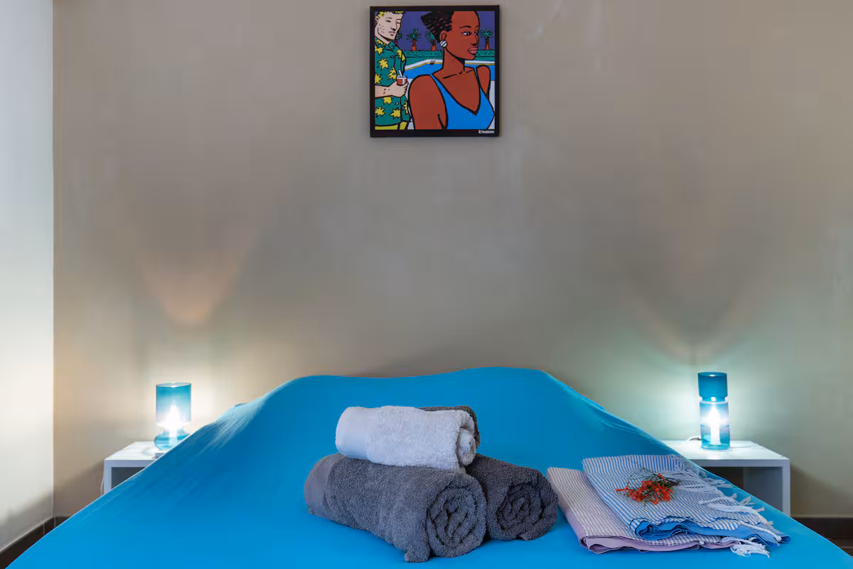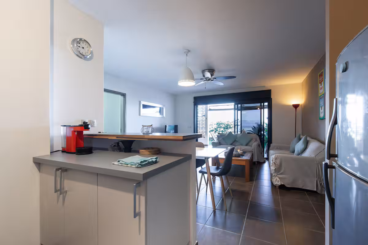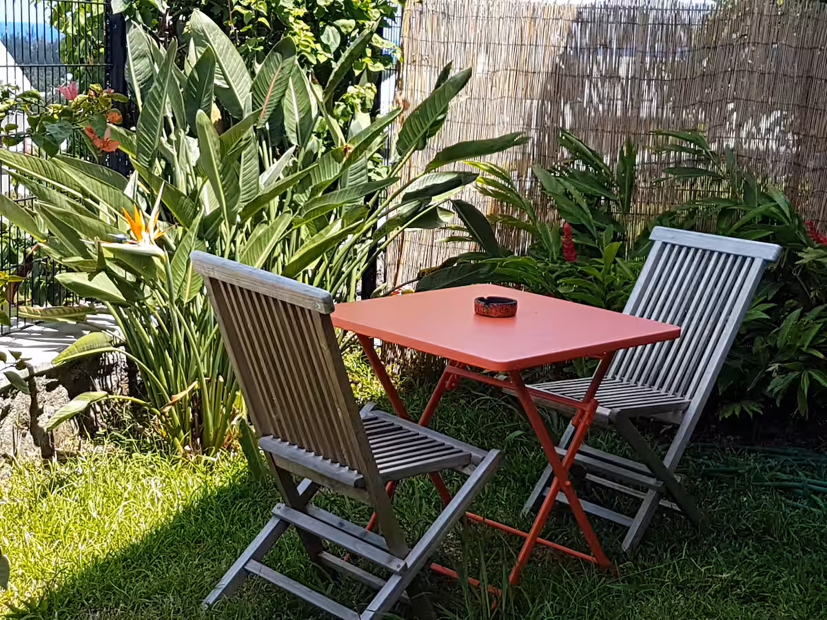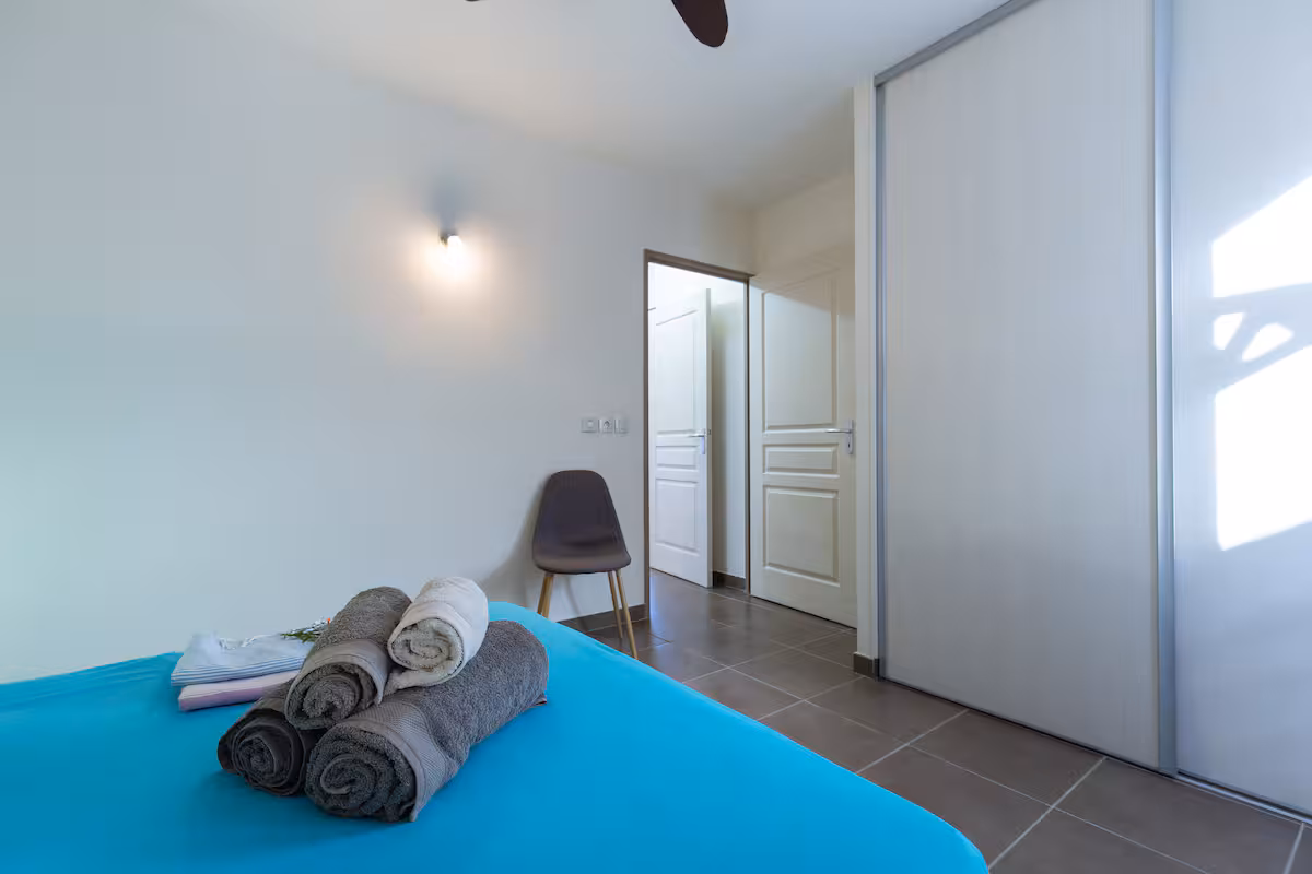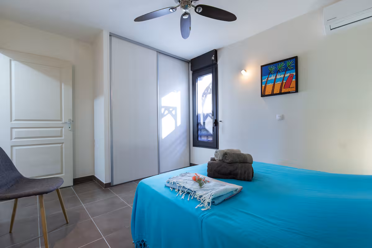You have two bedrooms with ceiling fans, quiet air conditioning, a well-equipped open kitchen, a large veranda to enjoy the view, and a small garden. The property is designed to provide a pleasant separation between the day area and the sleeping area.