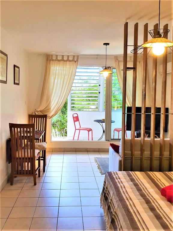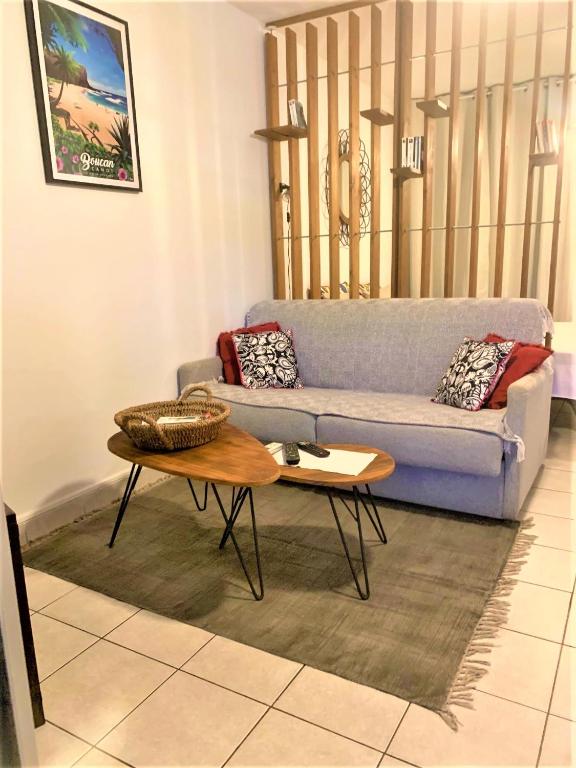 Charmant T1 tout confort à Saint-Gilles les Bains, avec terrasse, cuisine équipée, lave-linge, Wi-Fi gratuit, climatisation et parking gratuit.
